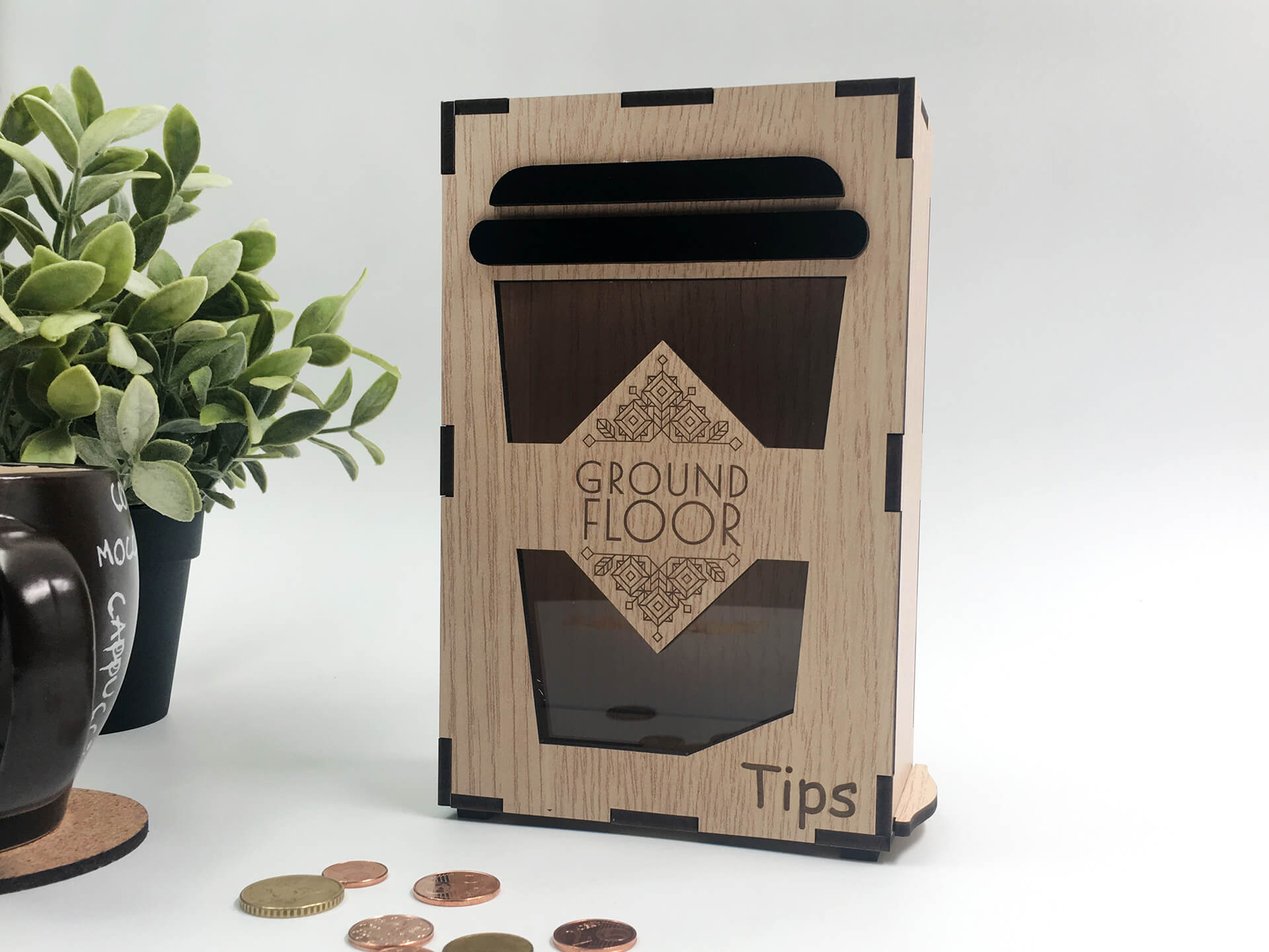 Κατασκευή από ξύλο και ακρυλικό για τα tips με το λογότυπο της επιχείρησης. Διαθέτει έξυπνο άνοιγμα για την αφαίρεση των χρημάτων. • Υλικά: Λακαριστό Δρυς πάχους 4mm, διάφανο ακρυλικό πάχους 4mm