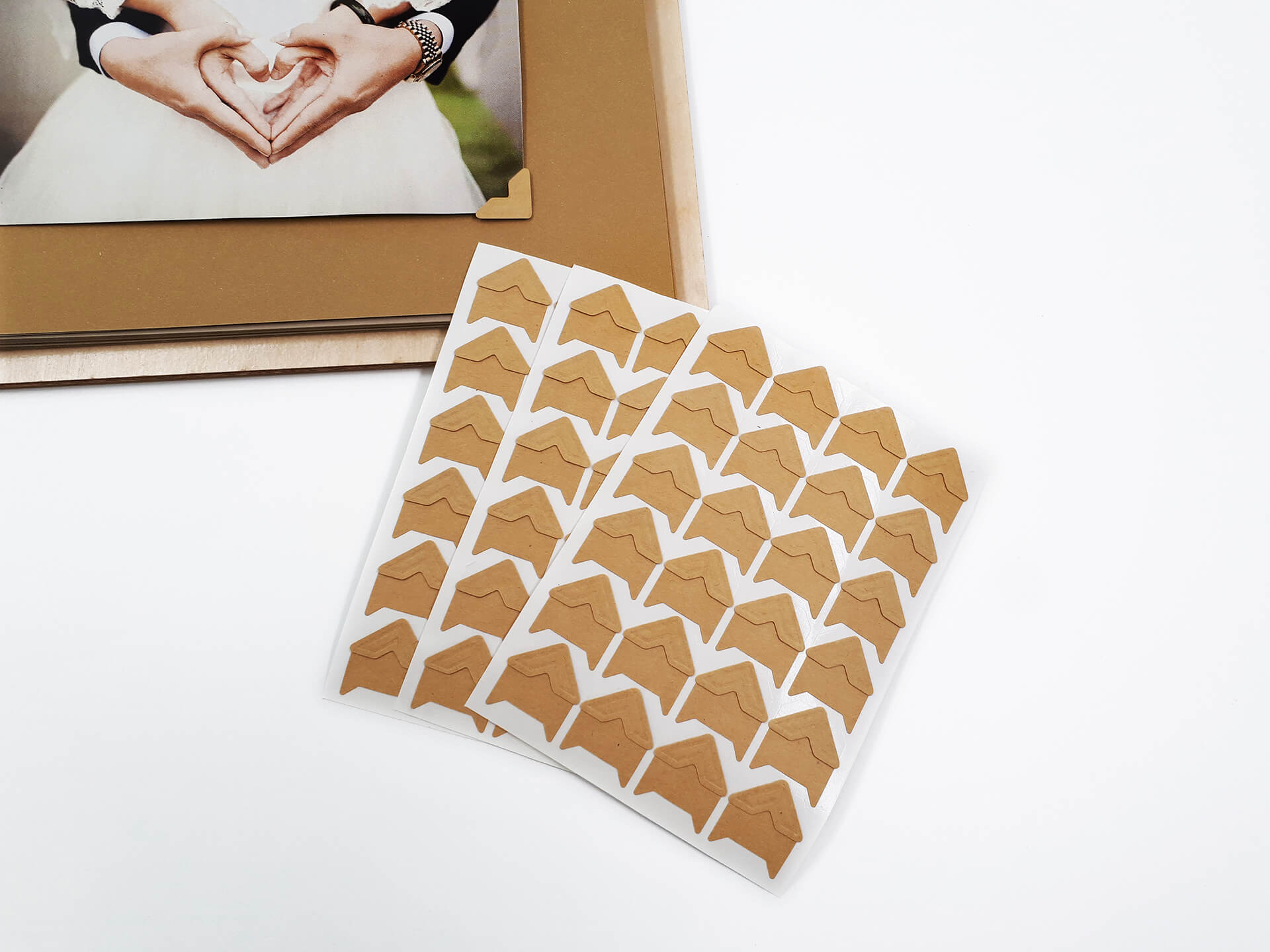 • Υλικά: Εξωτερική κατασκευή από ξύλο κόντρα πλακέ θαλάσσης σημύδα 4mm με επικάλυψη βερνικιού. Εσωτερικά, μεταλλικοί κρίκοι για τη συγκράτηση των σελίδων, φύλλα από χοντρό χαρτόνι για την τοποθέτηση των φωτογραφιών, ριζόχαρτο ανάμεσα στα φύλλα για την προστασία των φωτογραφιών και υφασμάτινη ταινία στο σημείο που ανοιγοκλείνει το άλμπουμ για συγκράτηση και μεγαλύτερη ανθεκτικότητα του ξύλου κατά τη χρήση. Δίνονται χάρτινες αυτοκόλλητες γωνίες για την τοποθέτηση των φωτογραφιών.