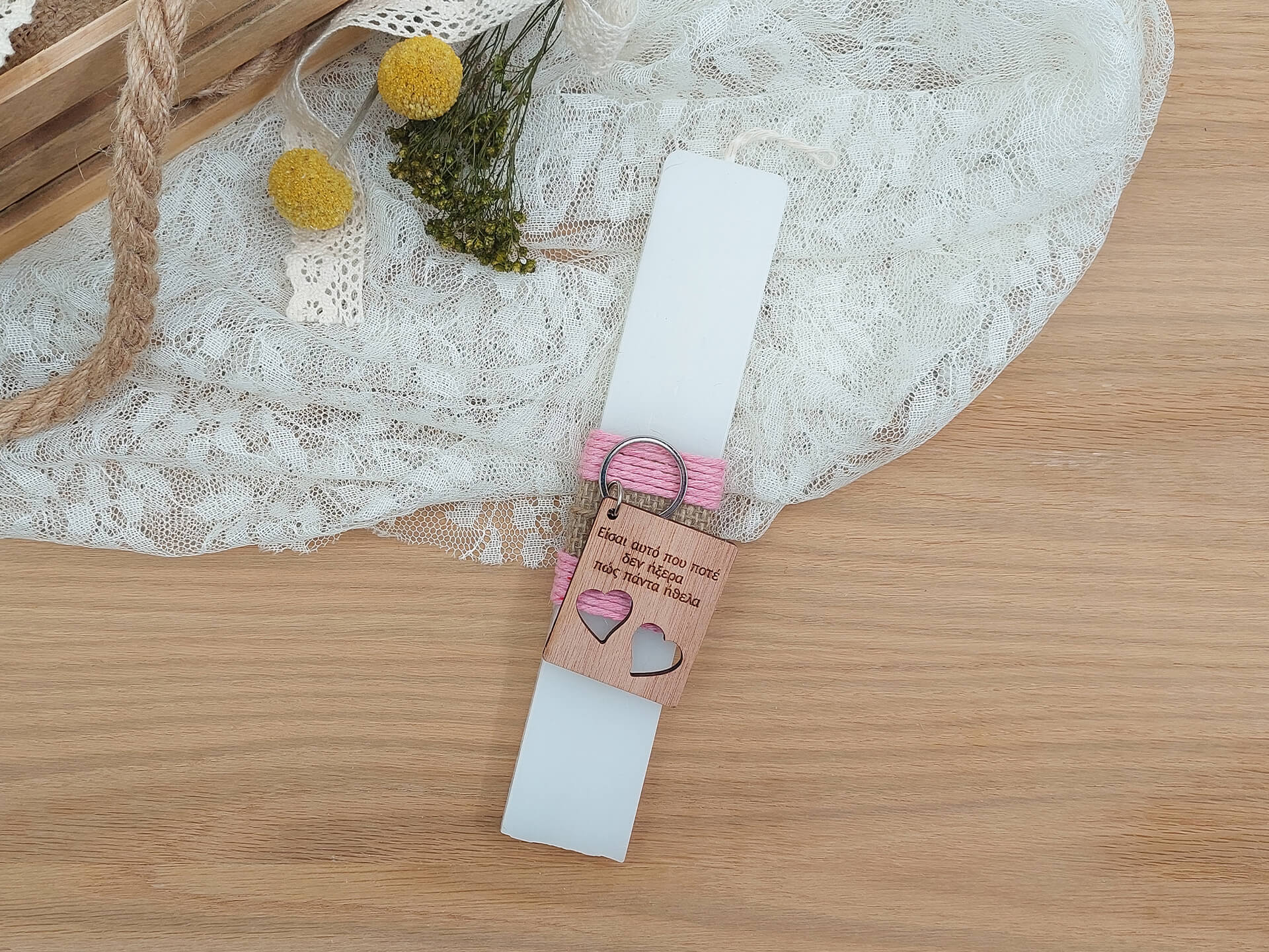 • Υλικά: Λαμπάδα πλακέ 22cm, Μπρελόκ από ξύλο κόντρα πλακέ οκουμέ πάχους 4mm