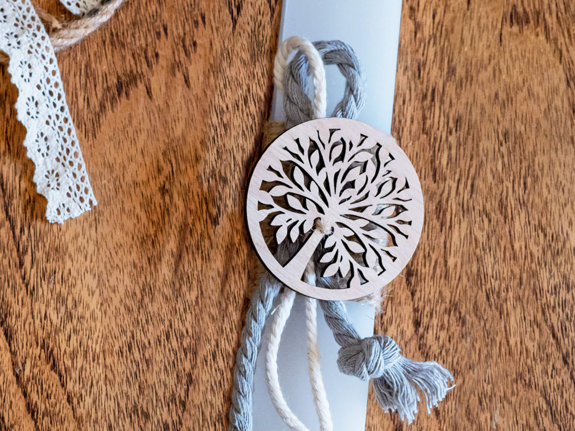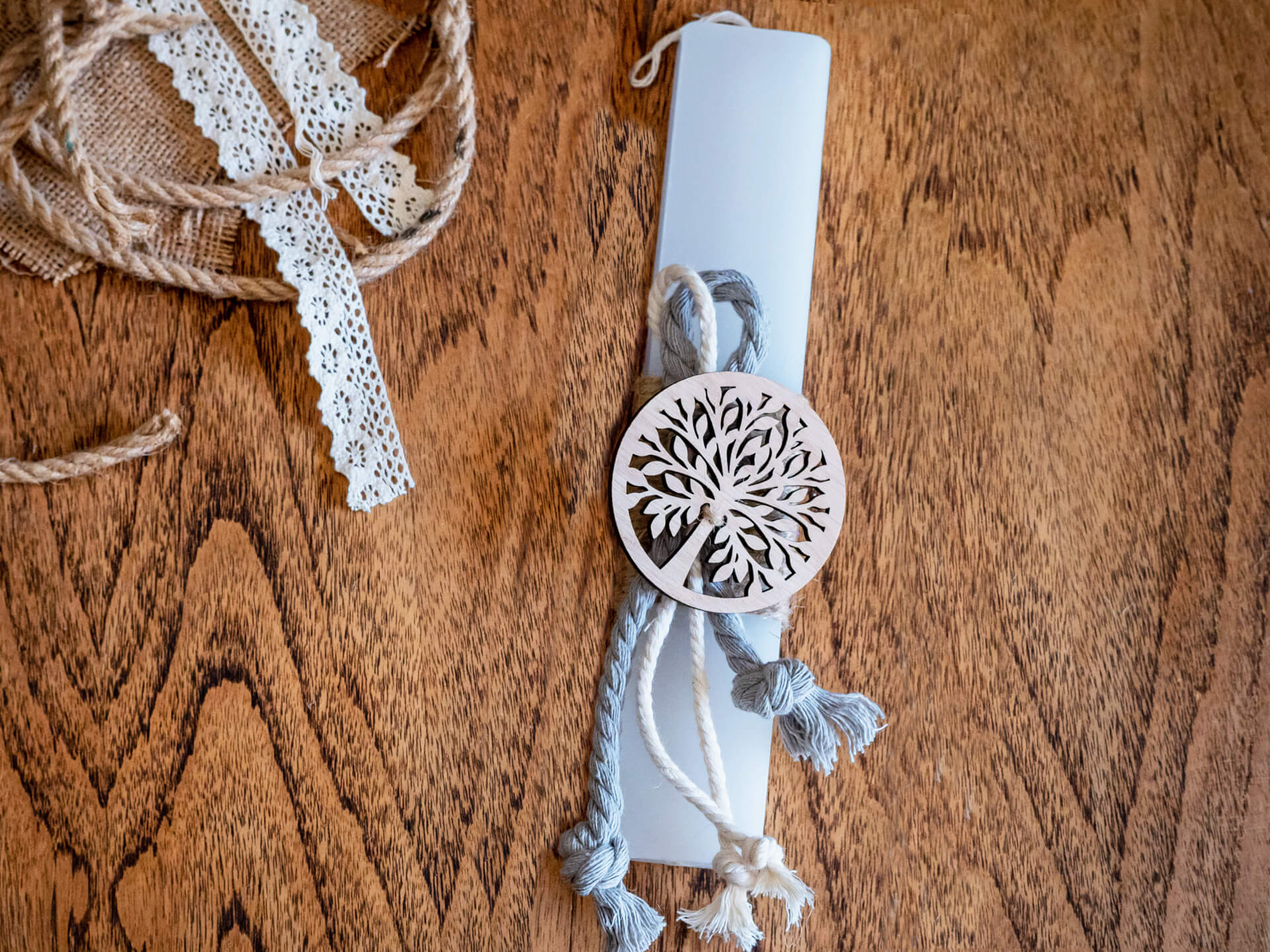 • Υλικά: Λαμπάδα λευκή πλακέ 22cm, διακοσμητικό στοιχείο από ξύλο δρυς πάχους 4mm
