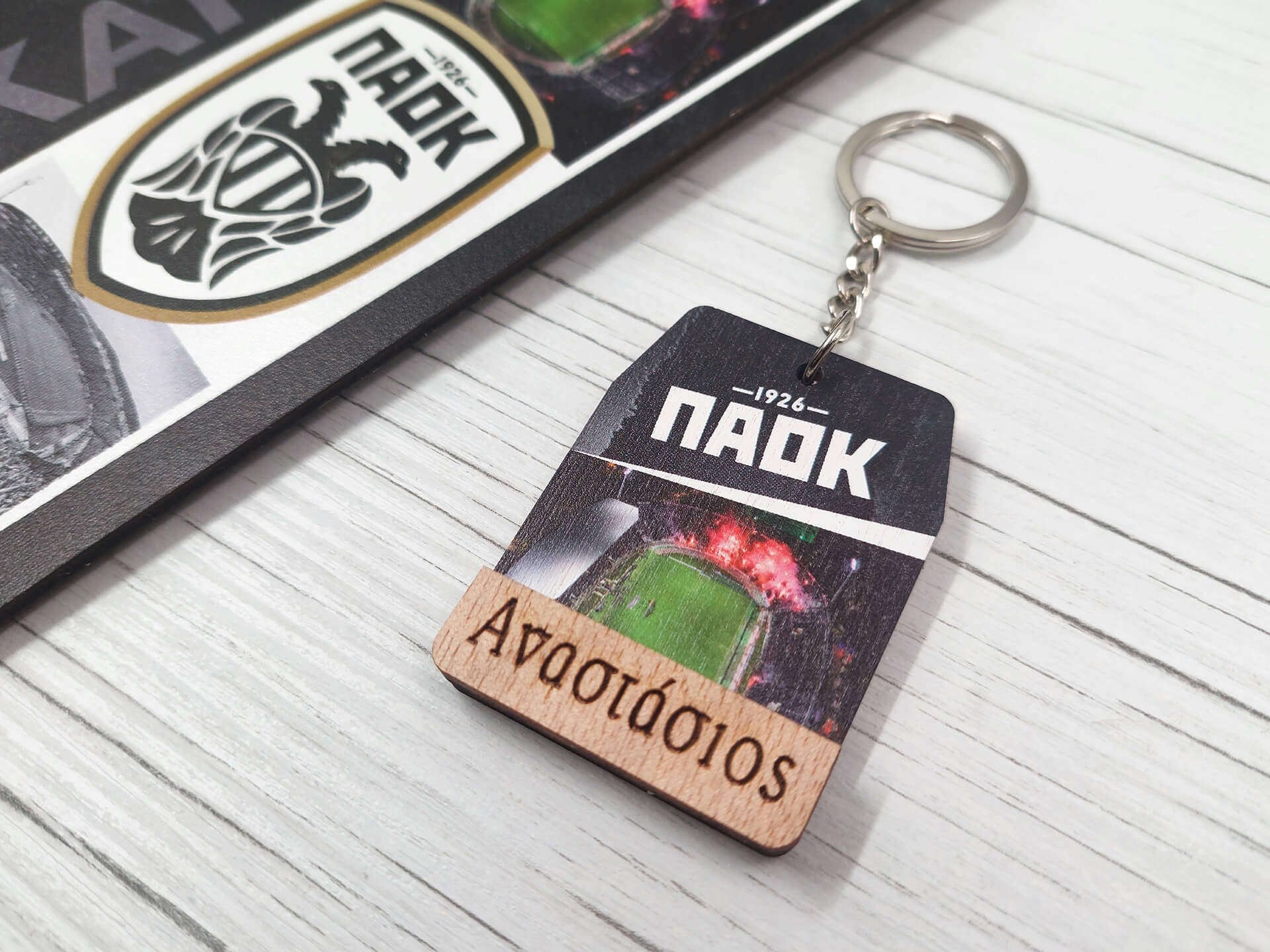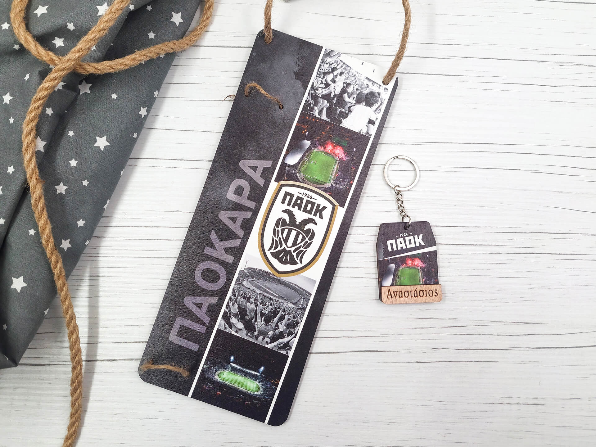 Ξύλινη διακοσμητική πλάτη για λαμπάδα και μπρελόκ με εκτύπωση, με θέμα την ομάδα του ΠΑΟΚ.