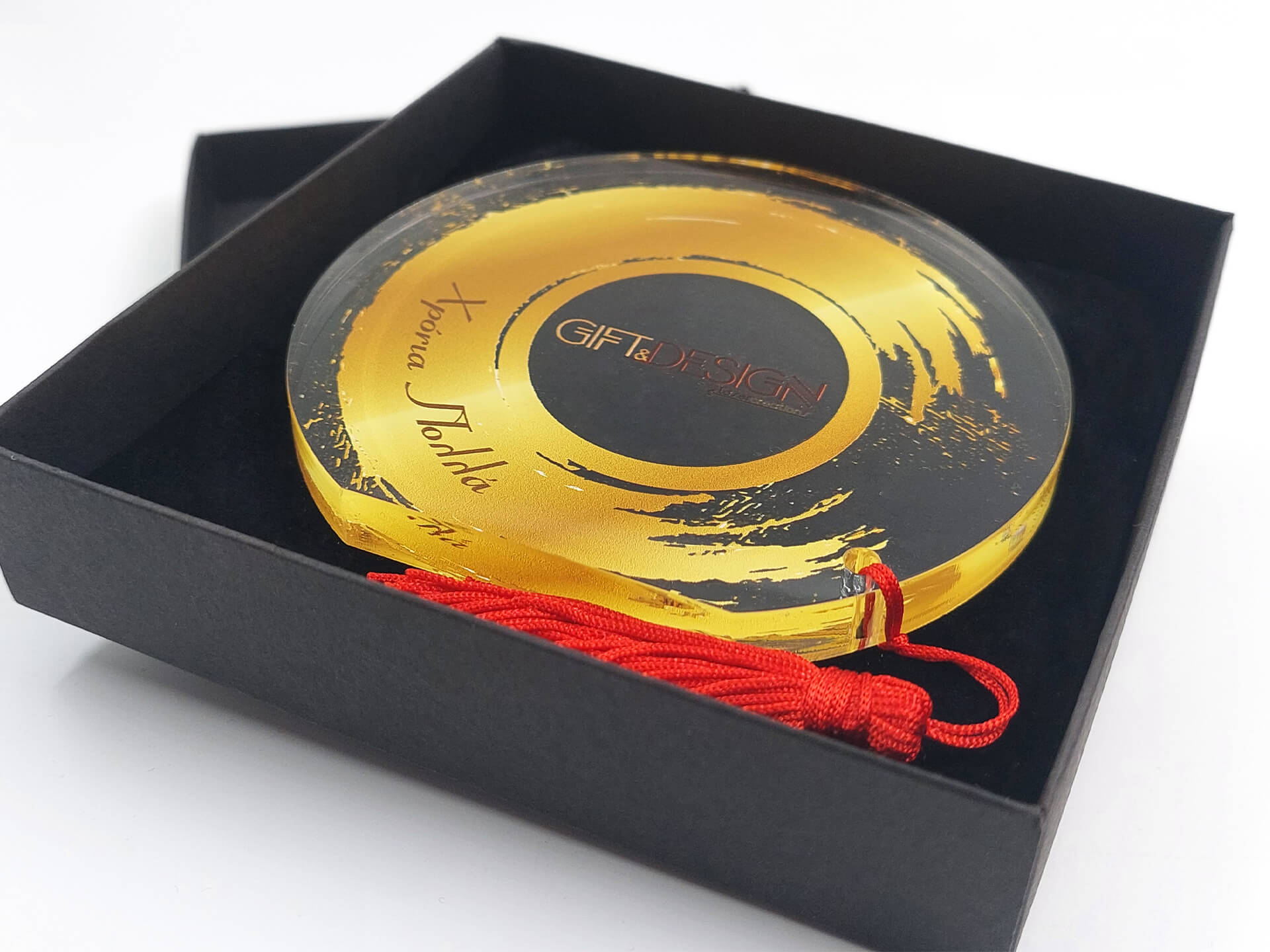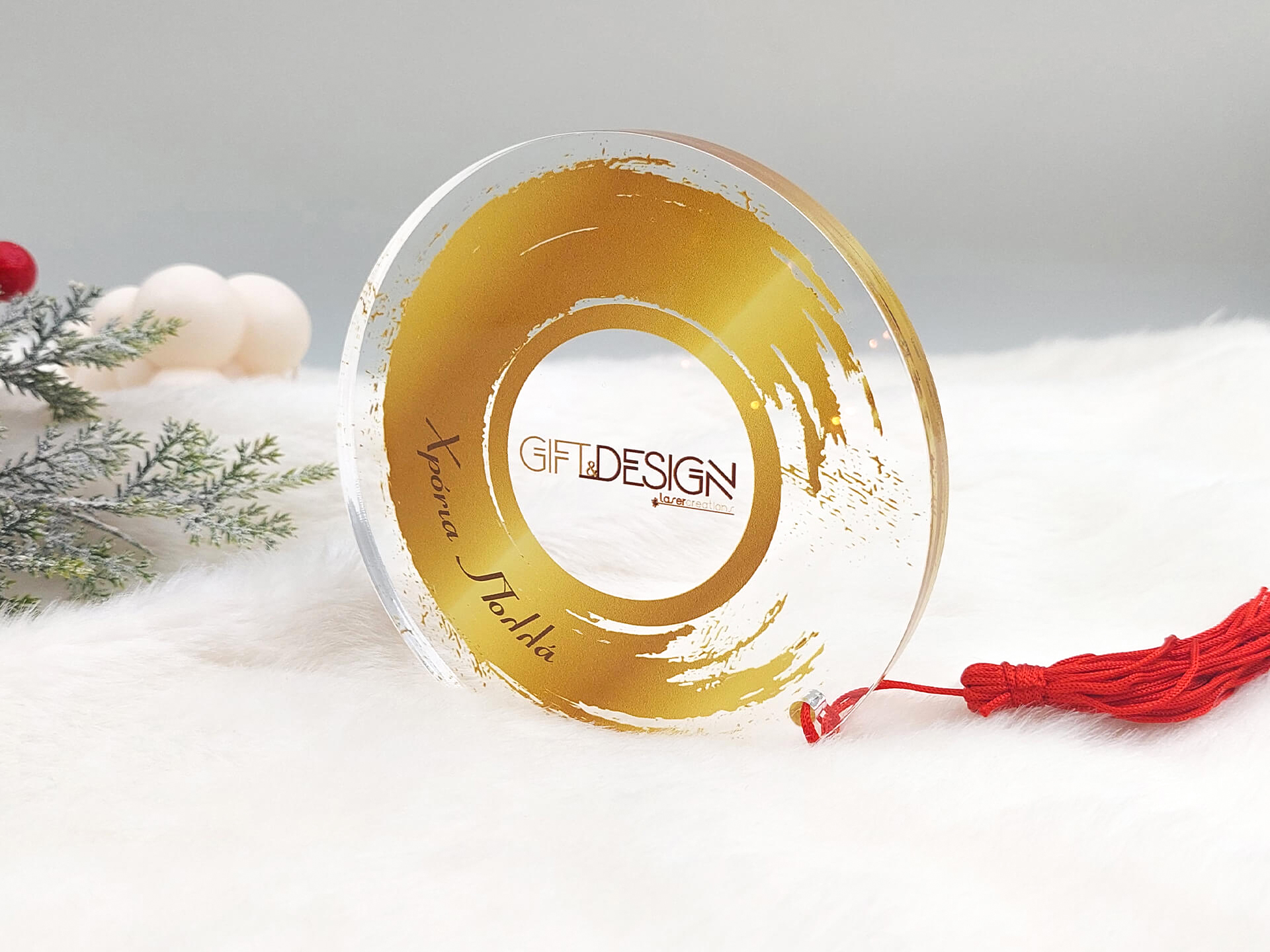 • Υλικά: Διάφανο Ακρυλικό πάχους 10mm με εκτύπωση, Κόκκινη φούντα