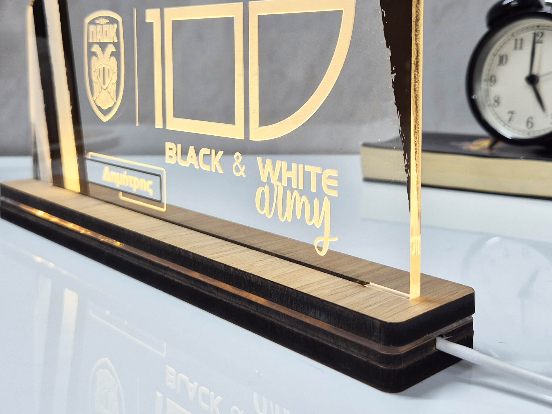 • Υλικά: Led λευκού χρώματος, Ακρυλικό διάφανο πάχους 6mm, Χειροποίητη βάση από ξύλο και ακρυλικό