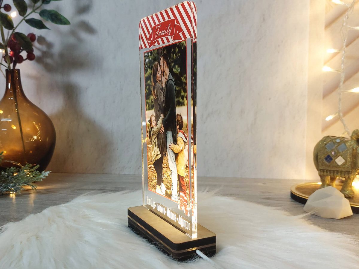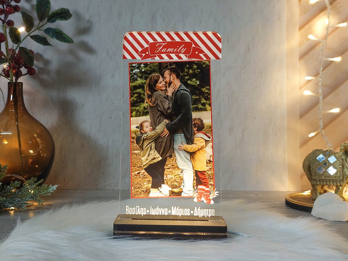 • Υλικά: Led λευκού χρώματος, Ακρυλικό διάφανο πάχους 6mm, Χειροποίητη βάση από ξύλο και ακρυλικό
