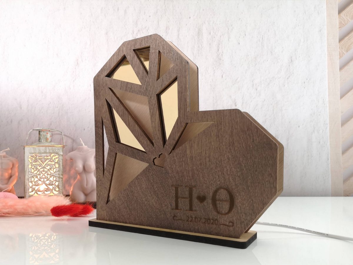 Φωτιστικό Led καρδιά από ξύλο με ξύλινη χειροποίητη βάση δικής μας πρωτοποριακής σχεδίασης και κατασκευής.
