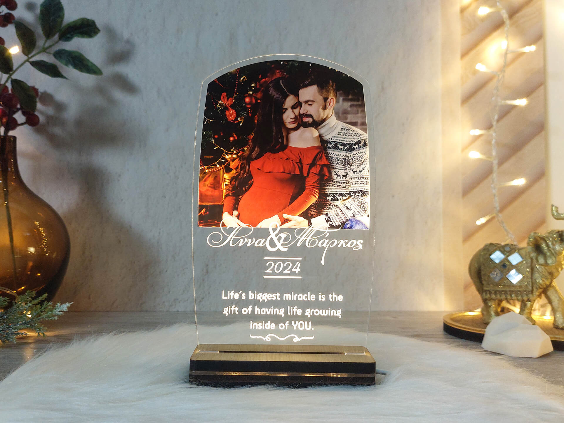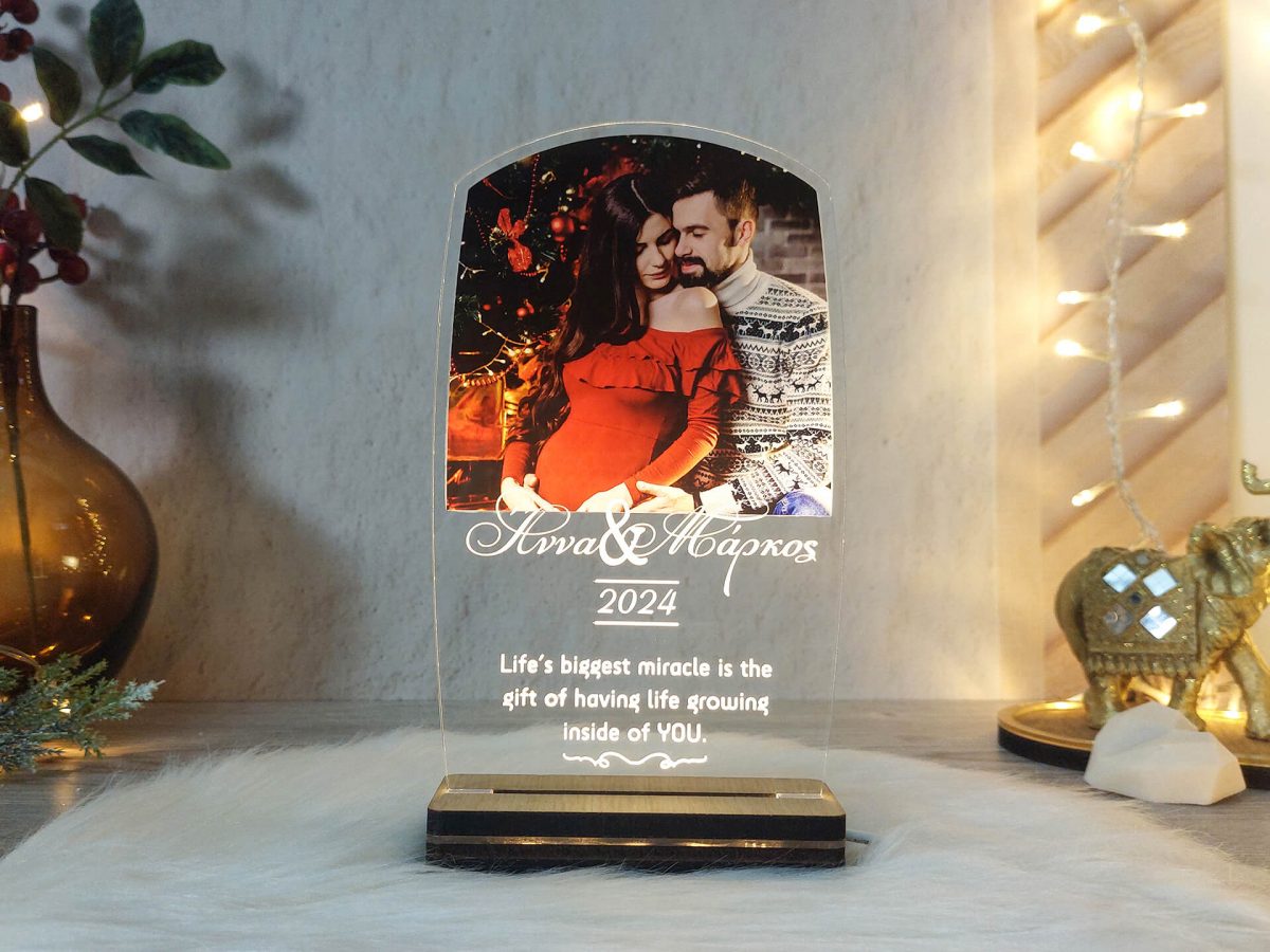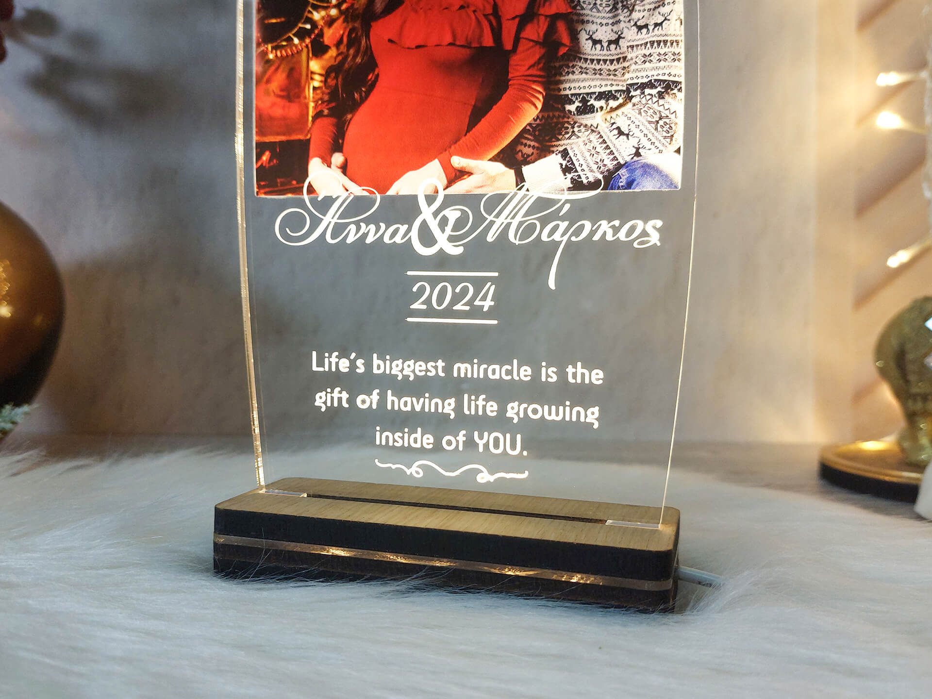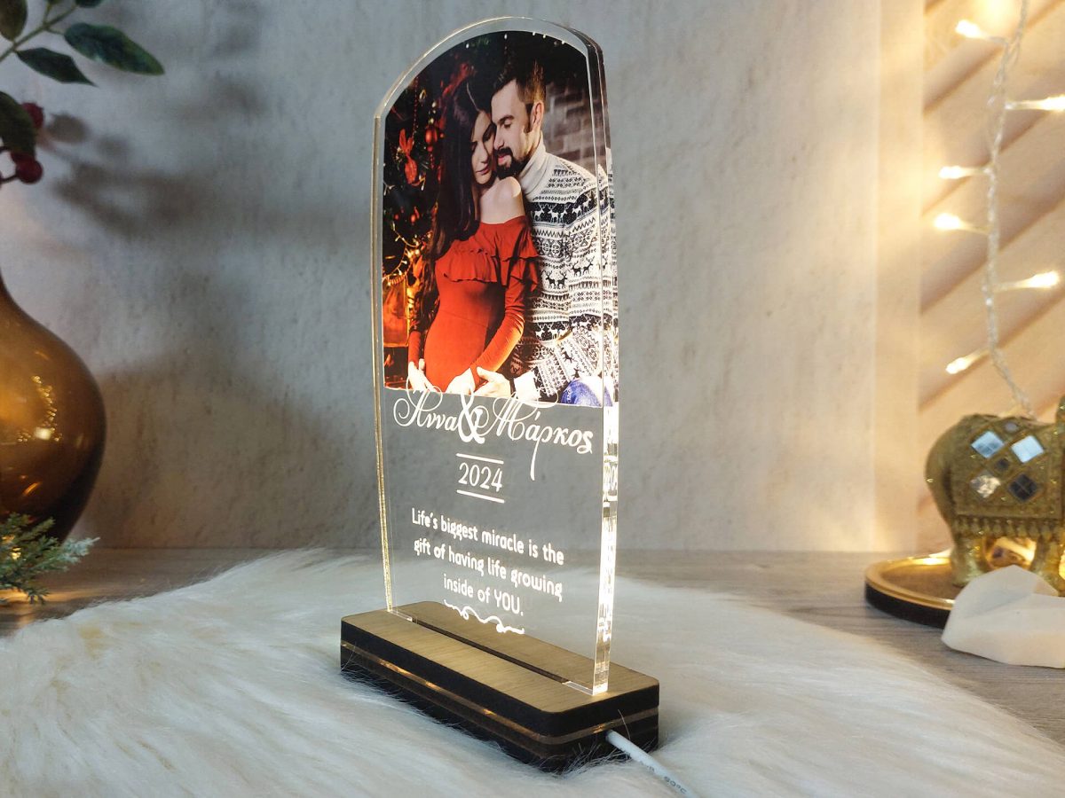 • Υλικά: Led λευκού χρώματος, Ακρυλικό διάφανο πάχους 6mm, Χειροποίητη βάση από ξύλο και ακρυλικό