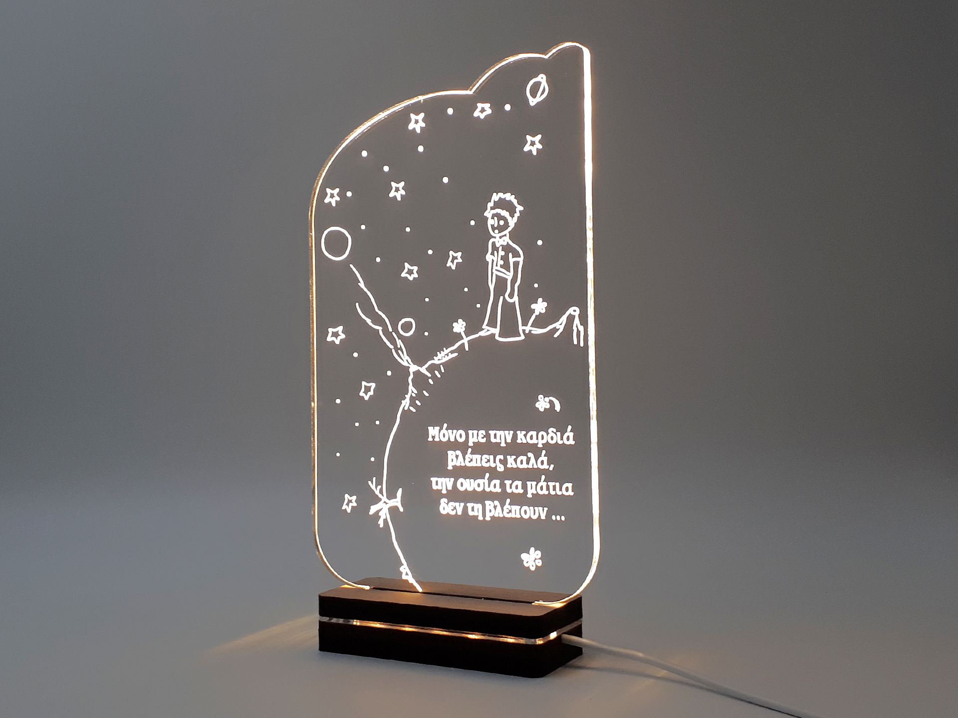 • Υλικά: Led λευκού χρώματος, Ακρυλικό διάφανο πάχους 6mm, Χειροποίητη βάση από ξύλο και ακρυλικό