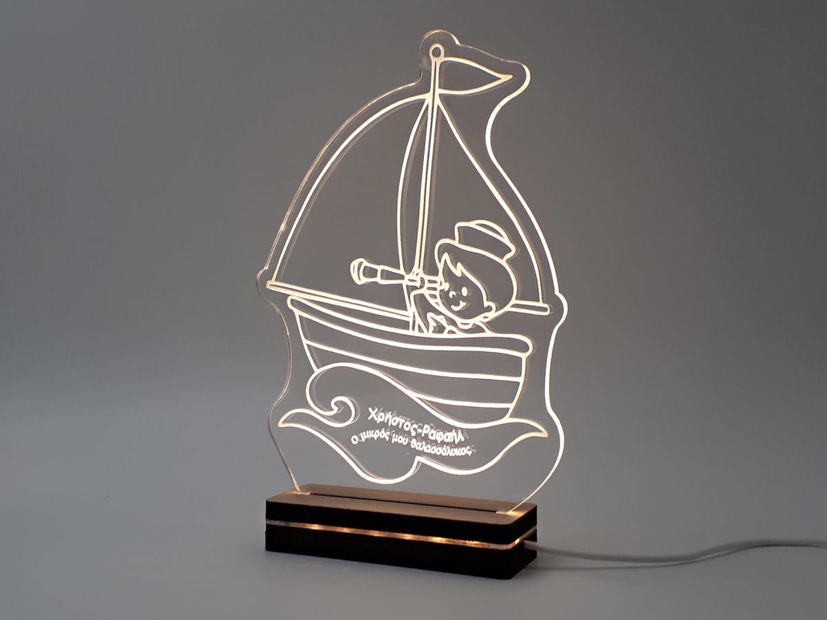 Φωτιστικό Led από ακρυλικό και ξύλινη χειροποίητη βάση δικής μας πρωτοποριακής σχεδίασης και κατασκευής.