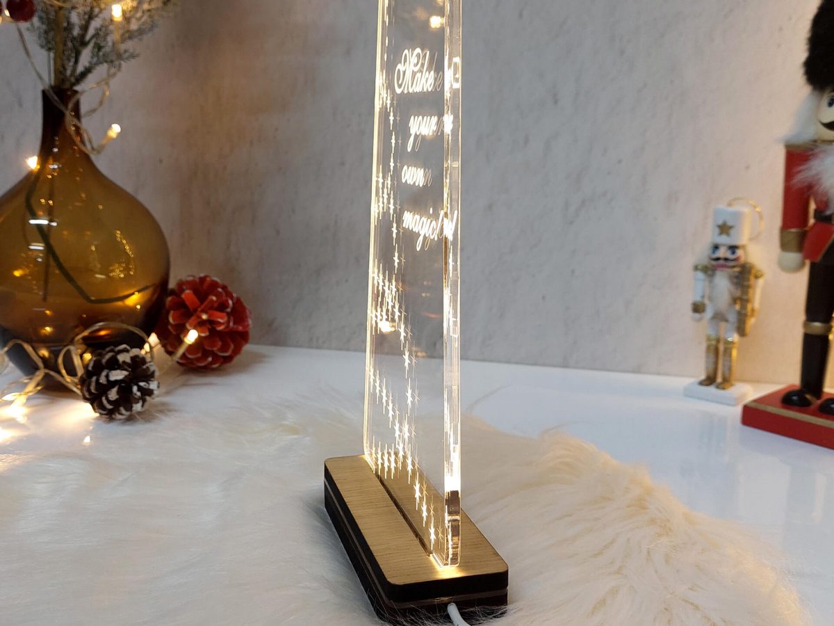 • Υλικά: Led λευκού χρώματος, Ακρυλικό διάφανο πάχους 6mm, Χειροποίητη βάση από ξύλο και ακρυλικό