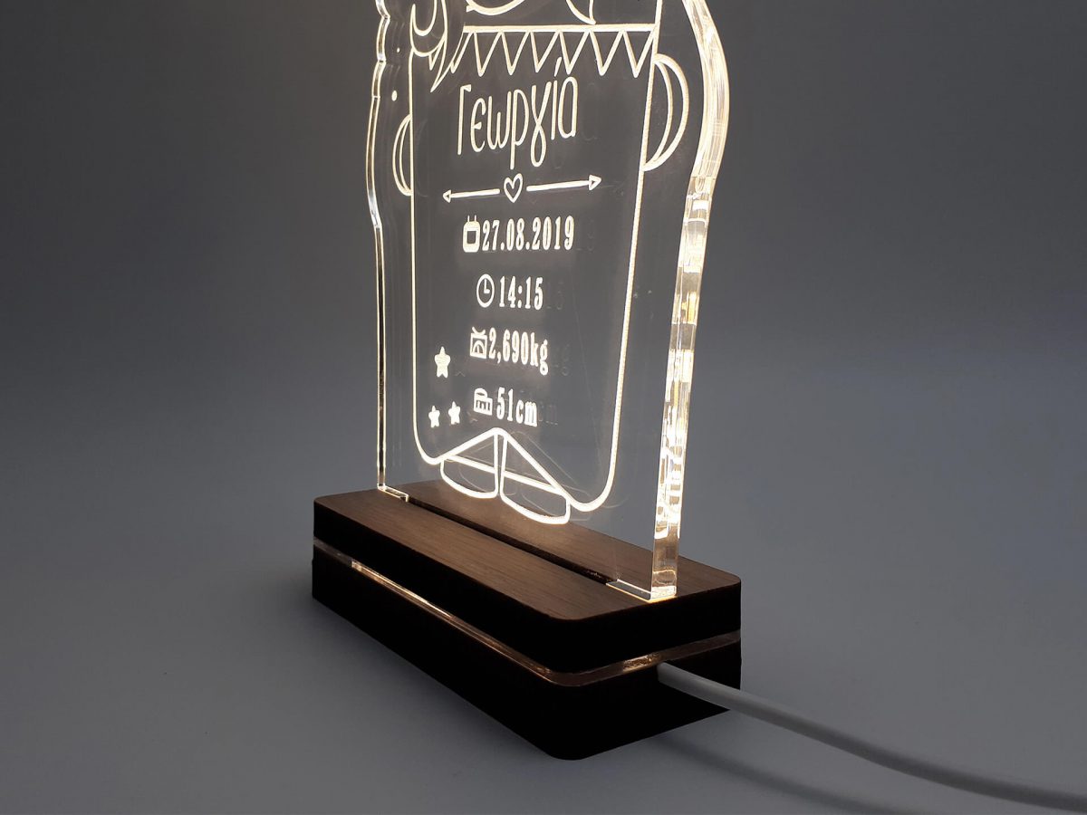 • Υλικά: Led λευκού χρώματος, Ακρυλικό διάφανο πάχους 6mm, Χειροποίητη βάση από ξύλο και ακρυλικό