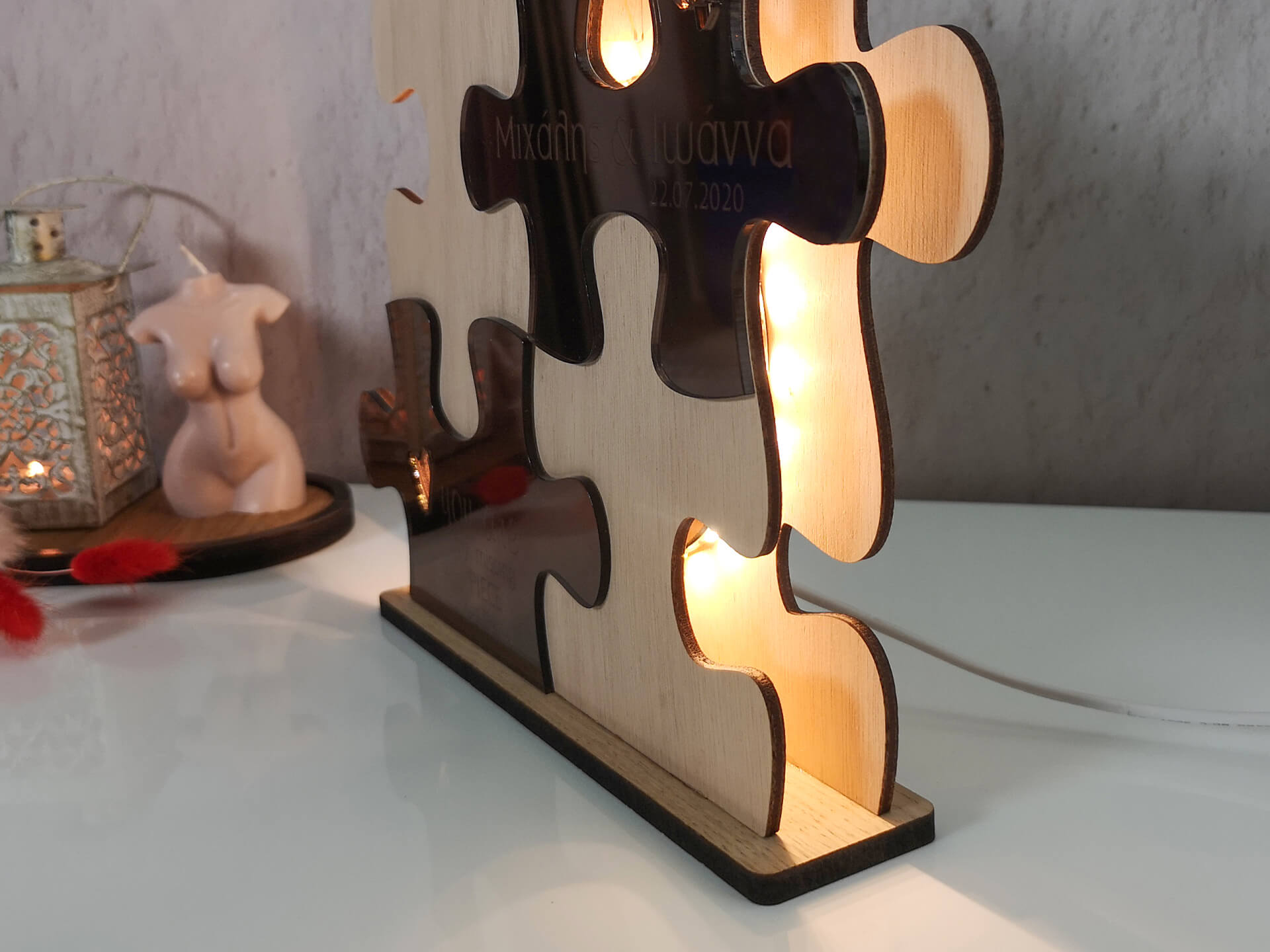 Φωτιστικό Led puzzle από ξύλο με ξύλινη χειροποίητη βάση δικής μας πρωτοποριακής σχεδίασης και κατασκευής.