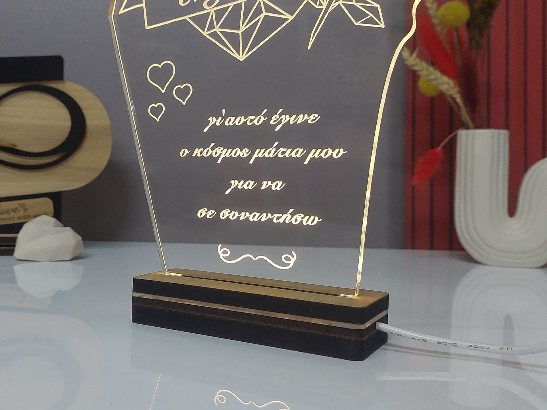 • Υλικά: Led κόκκινου χρώματος, Ακρυλικό διάφανο πάχους 6mm, Χειροποίητη βάση από ξύλο και ακρυλικό