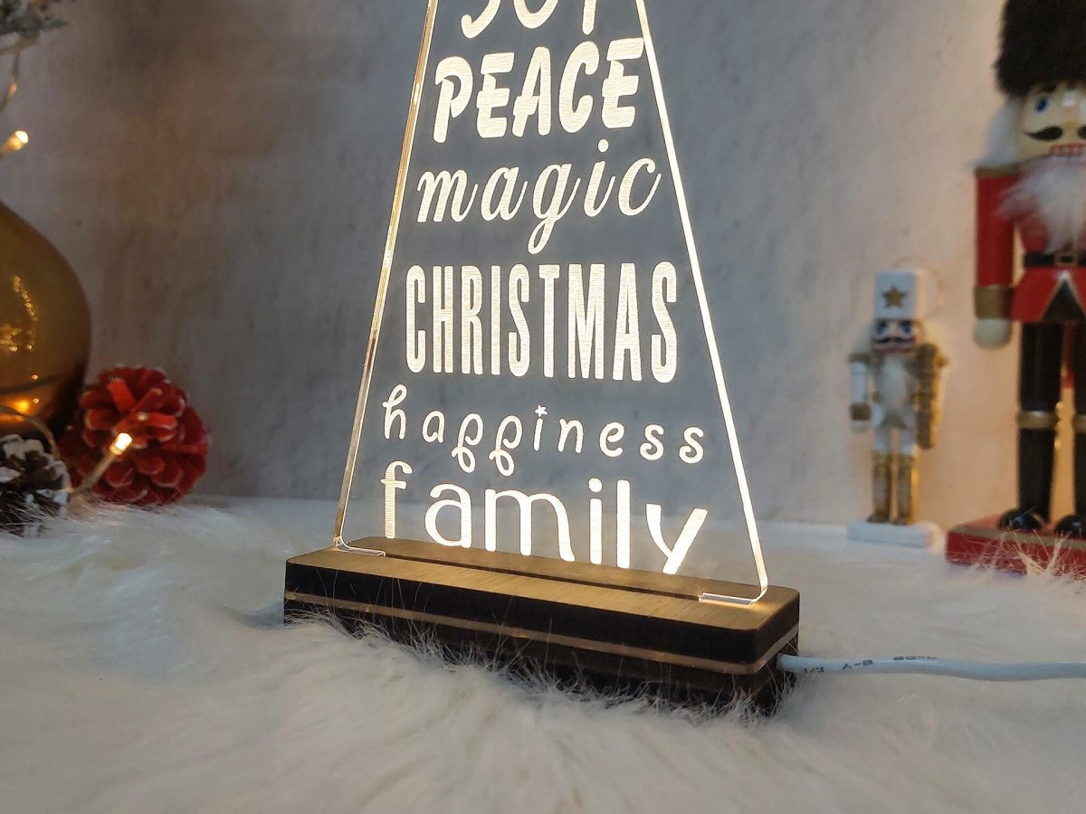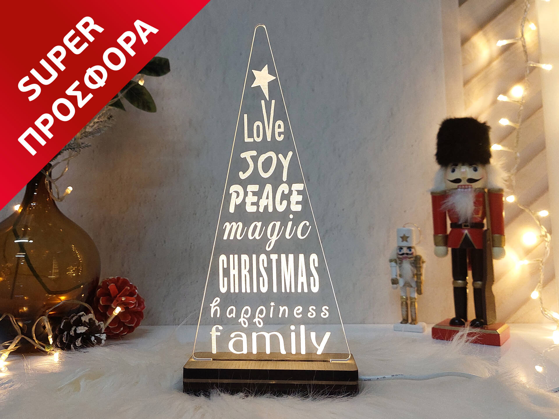 • Υλικά: Led λευκού χρώματος, Ακρυλικό διάφανο πάχους 6mm, Χειροποίητη βάση από ξύλο και ακρυλικό