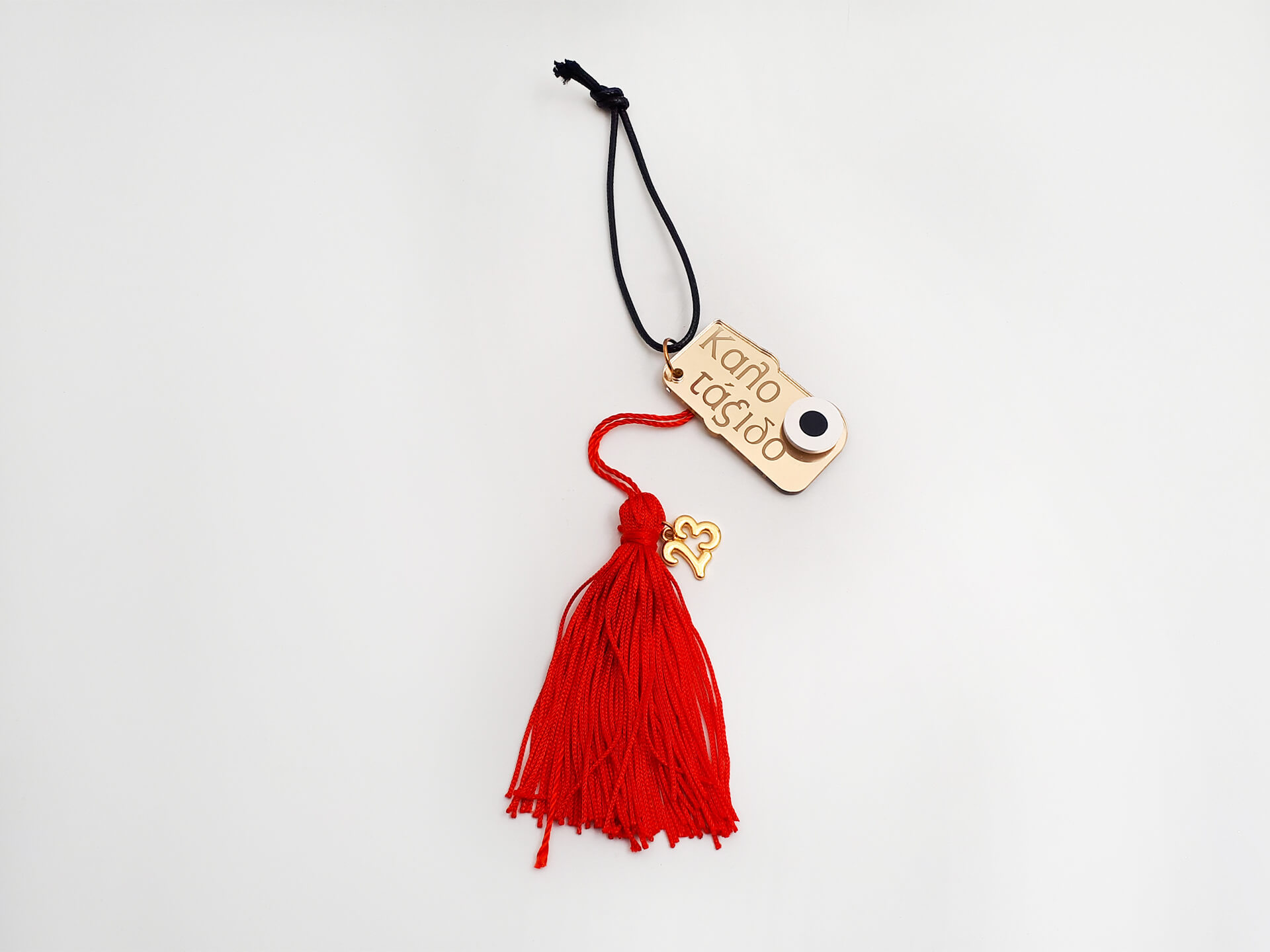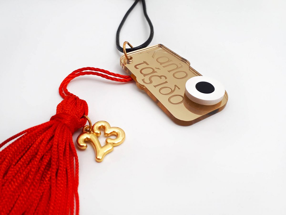 • Υλικά: Λεπτό κορδόνι, κόκκινη φούντα, διακοσμητικό από ακρυλικό(plexiglass) καθρέπτης χρυσό και μεταλλικό στοιχείο