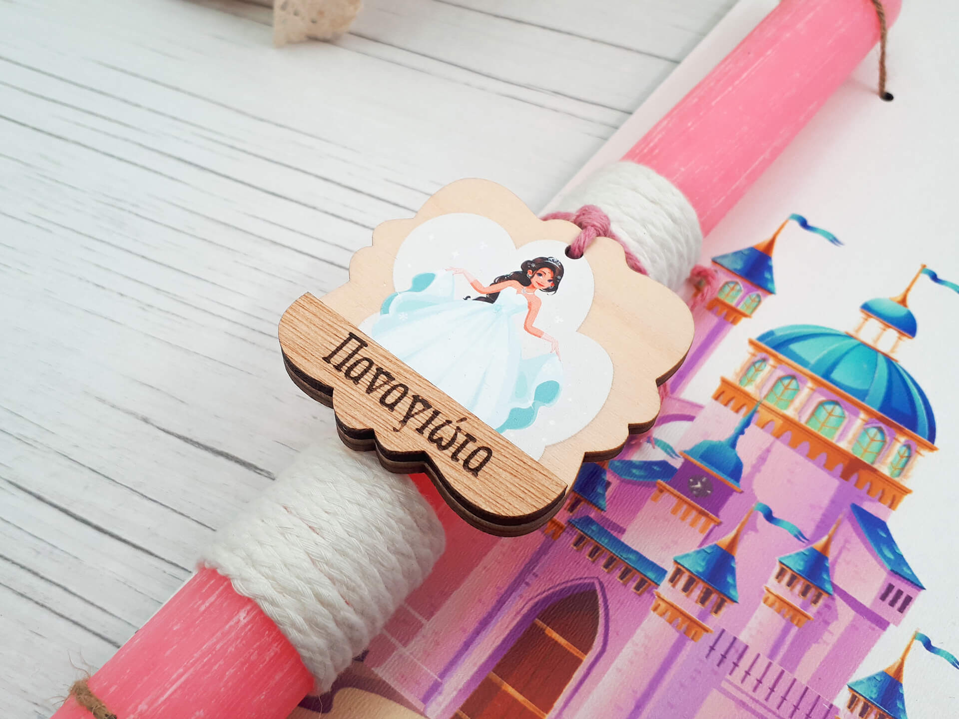 Προσωποποιημένη πασχαλινή λαμπάδα για κορίτσι με ξύλινη διακοσμητική πλάτη και διακοσμητικά στοιχεία!