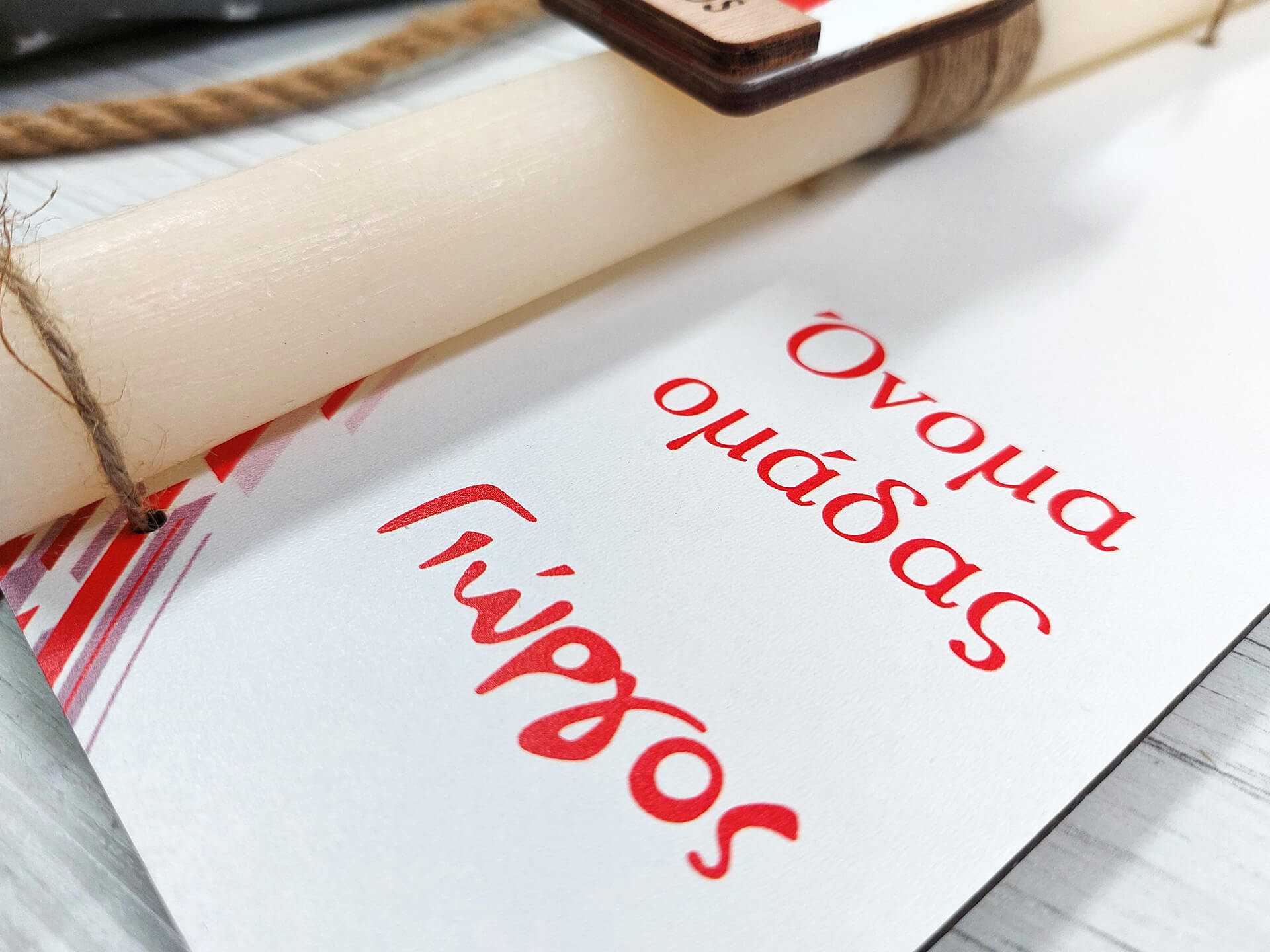 • Υλικά: Αρωματική λαμπάδα στρογγυλή 27cm, ξύλινη διακοσμητική πλάτη 11.5x28cm με έγχρωμη εκτύπωση, από MDF λευκό λακαριστό πάχους 3mm, ξύλινο διακοσμητικό στοιχείο
