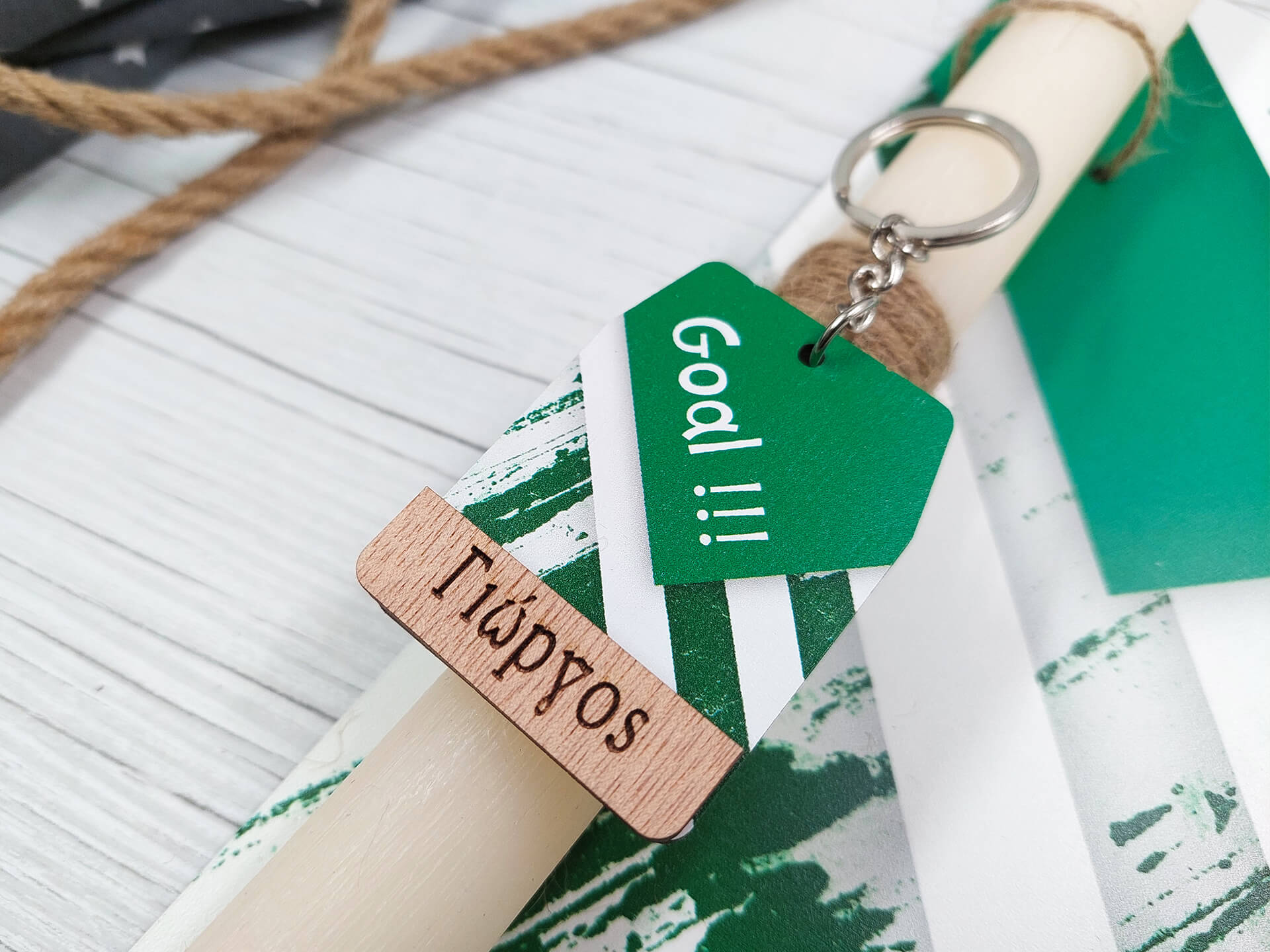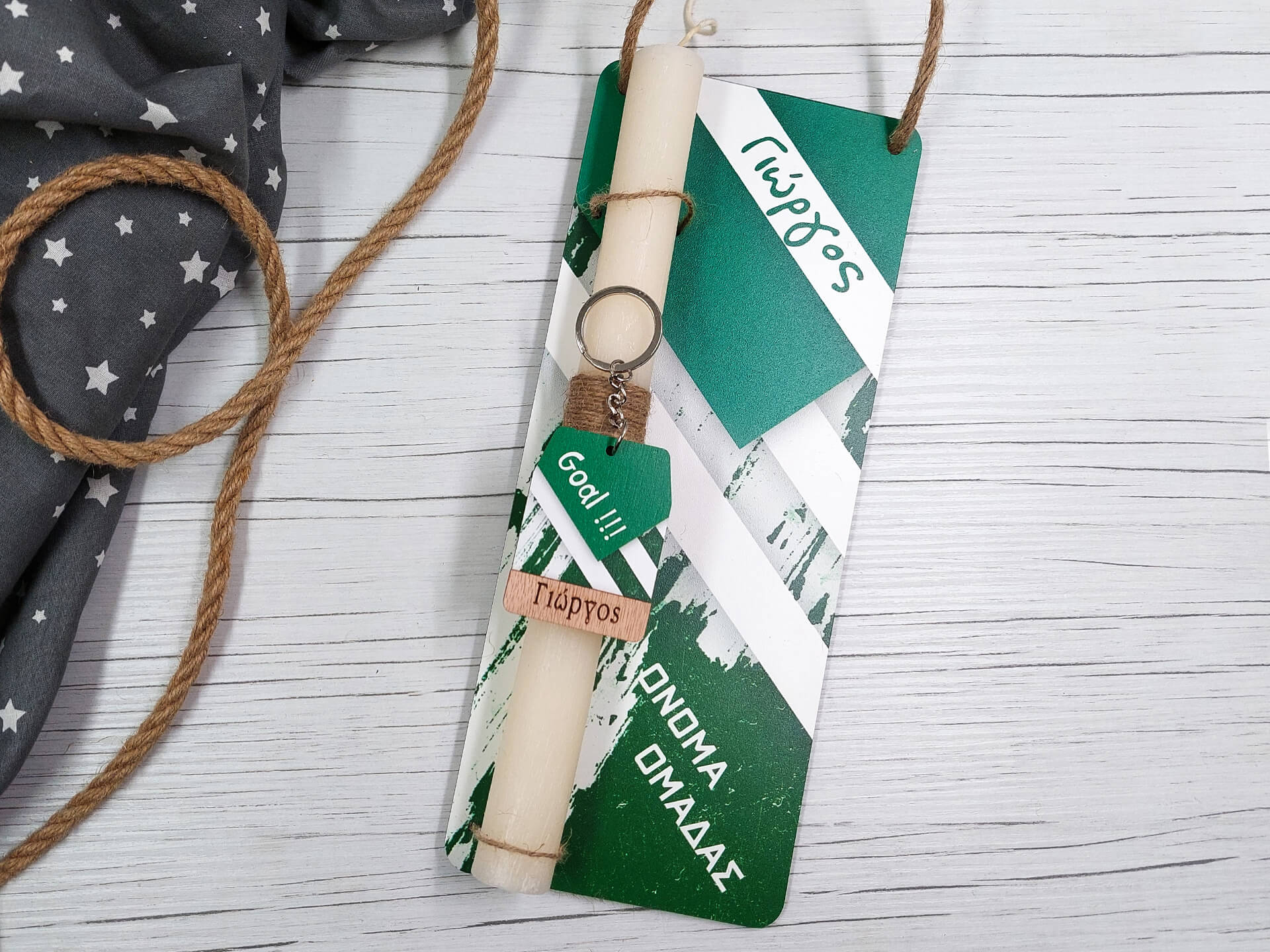 • Υλικά: Αρωματική λαμπάδα στρογγυλή 27cm, ξύλινη διακοσμητική πλάτη 11.5x28cm με έγχρωμη εκτύπωση, από MDF λευκό λακαριστό πάχους 3mm, ξύλινο διακοσμητικό στοιχείο
