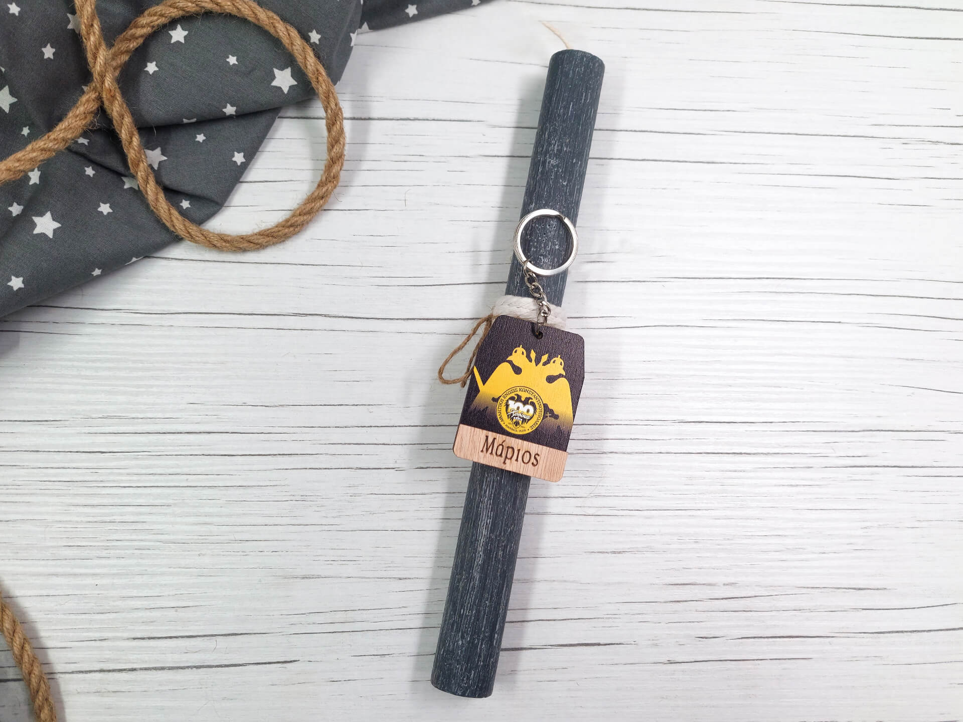 • Υλικά: Αρωματική λαμπάδα στρογγυλή 27cm, ξύλινο διακοσμητικό στοιχείο