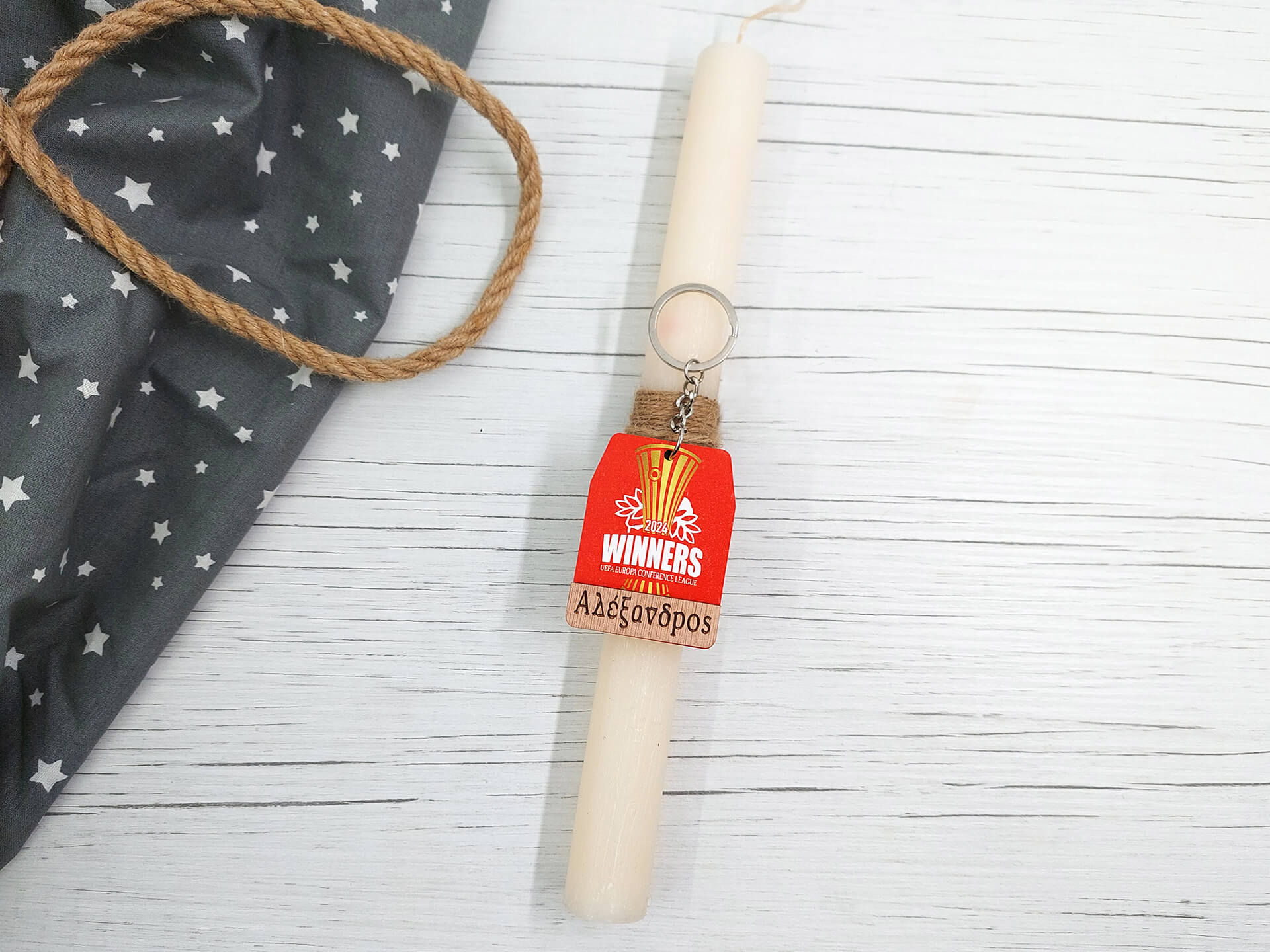 • Υλικά: Αρωματική λαμπάδα στρογγυλή 27cm, ξύλινο διακοσμητικό στοιχείο