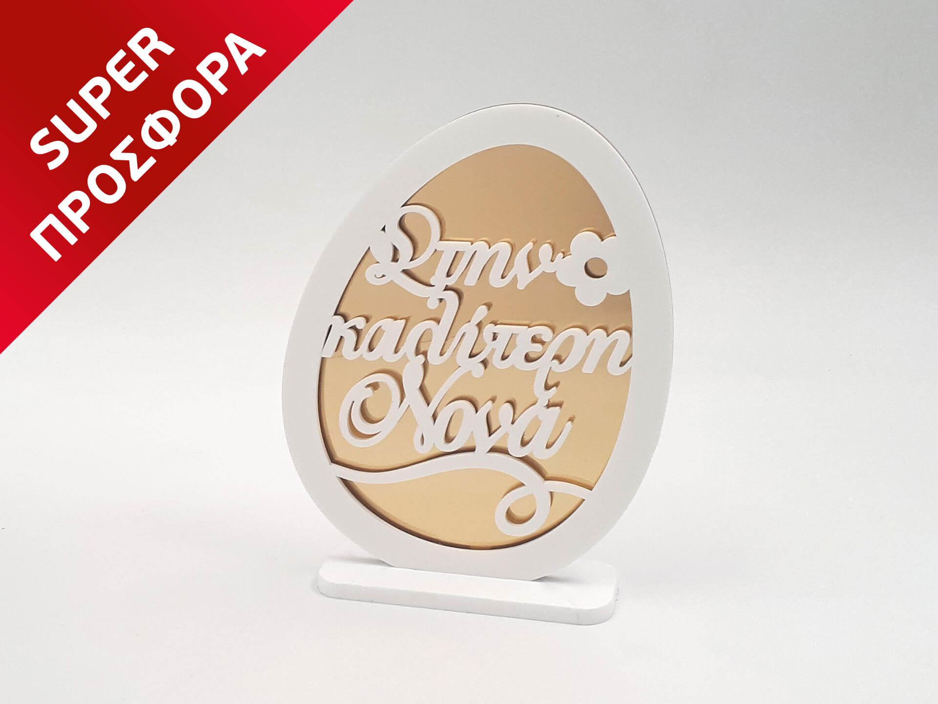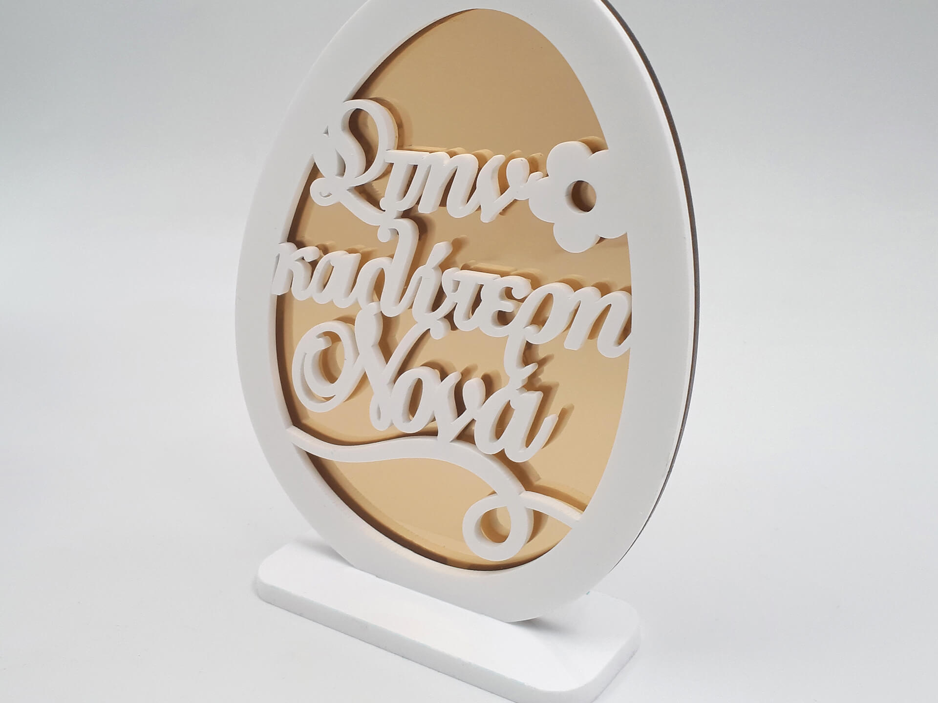 • Υλικά: Λευκό ακρυλικό πάχους 3mm και 5mm και χρυσός καθρέπτης πάχους 3mm