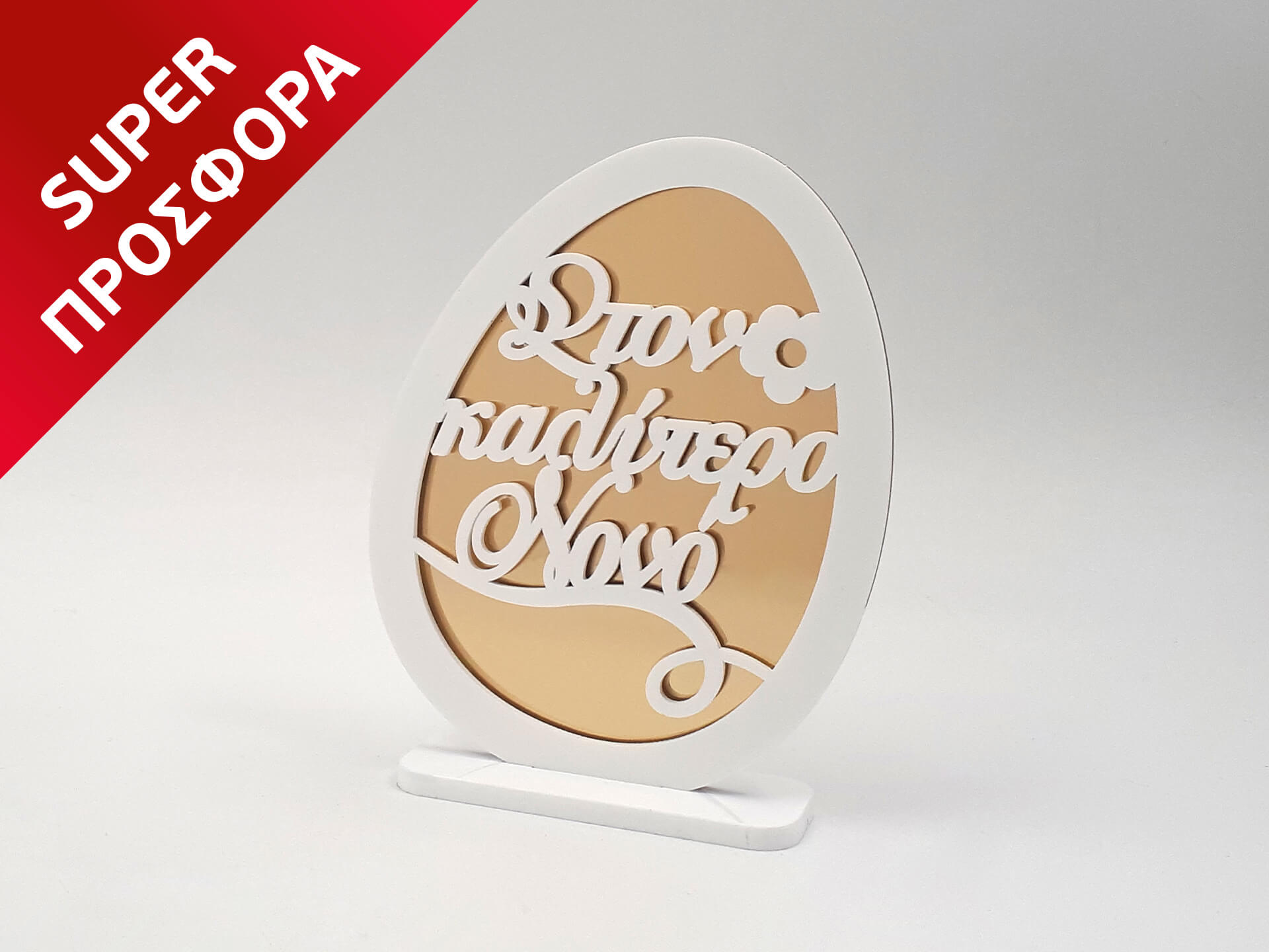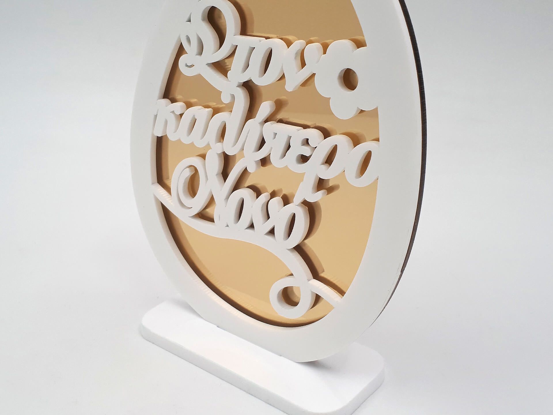• Υλικά: Λευκό ακρυλικό πάχους 3mm και 5mm και χρυσός καθρέπτης πάχους 3mm
