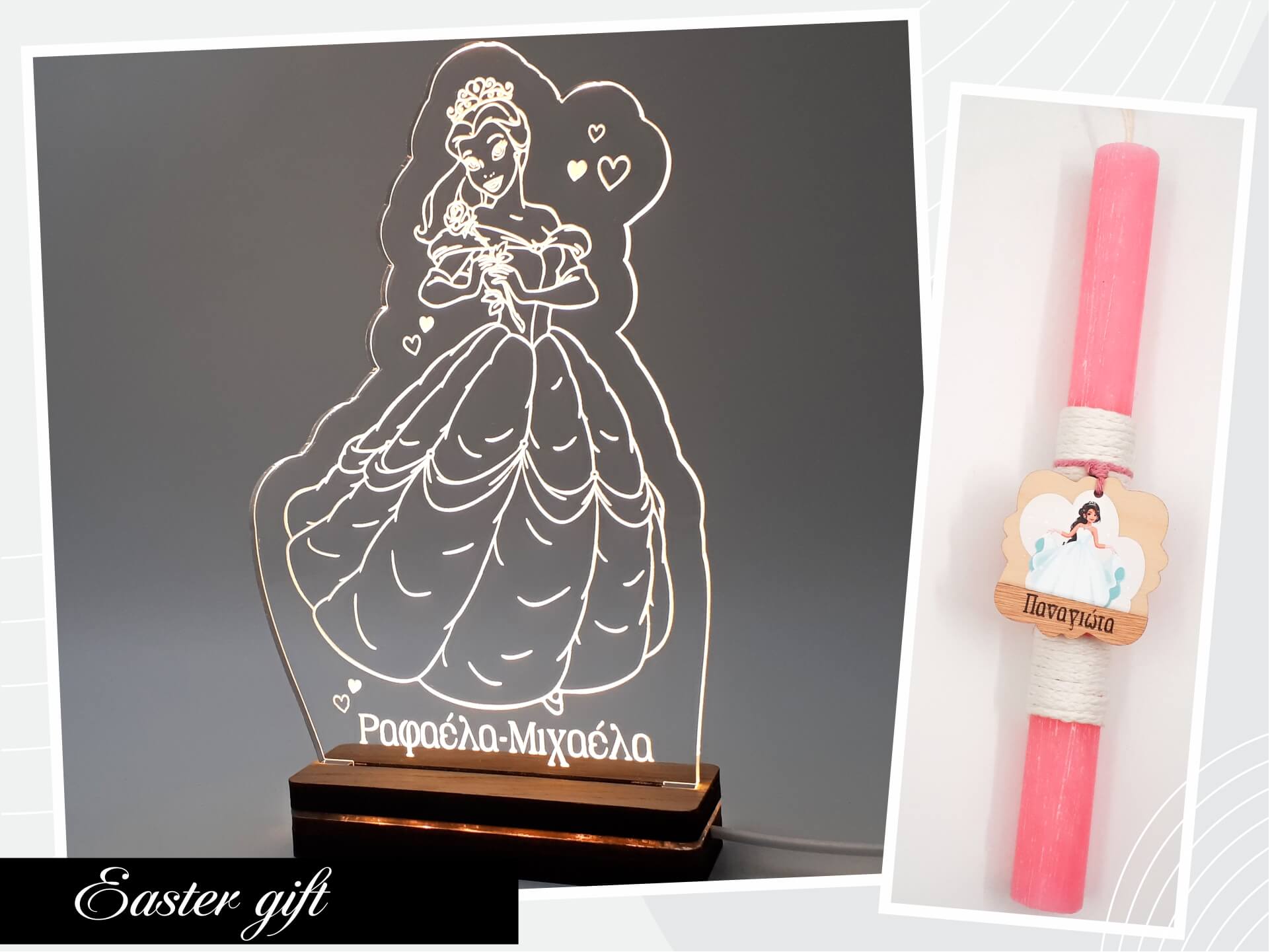 Πασχαλινό σετ δώρου με φωτιστικό Led από ακρυλικό και ξύλινη χειροποίητη βάση δικής μας πρωτοποριακής σχεδίασης και κατασκευής και πασχαλινή λαμπάδα!