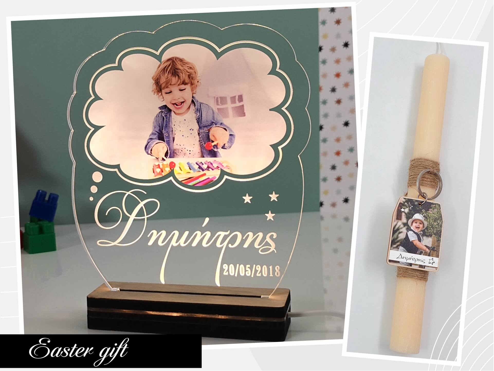 Πασχαλινό σετ δώρου με φωτιστικό Led από ακρυλικό και ξύλινη χειροποίητη βάση δικής μας πρωτοποριακής σχεδίασης και κατασκευής και πασχαλινή λαμπάδα!