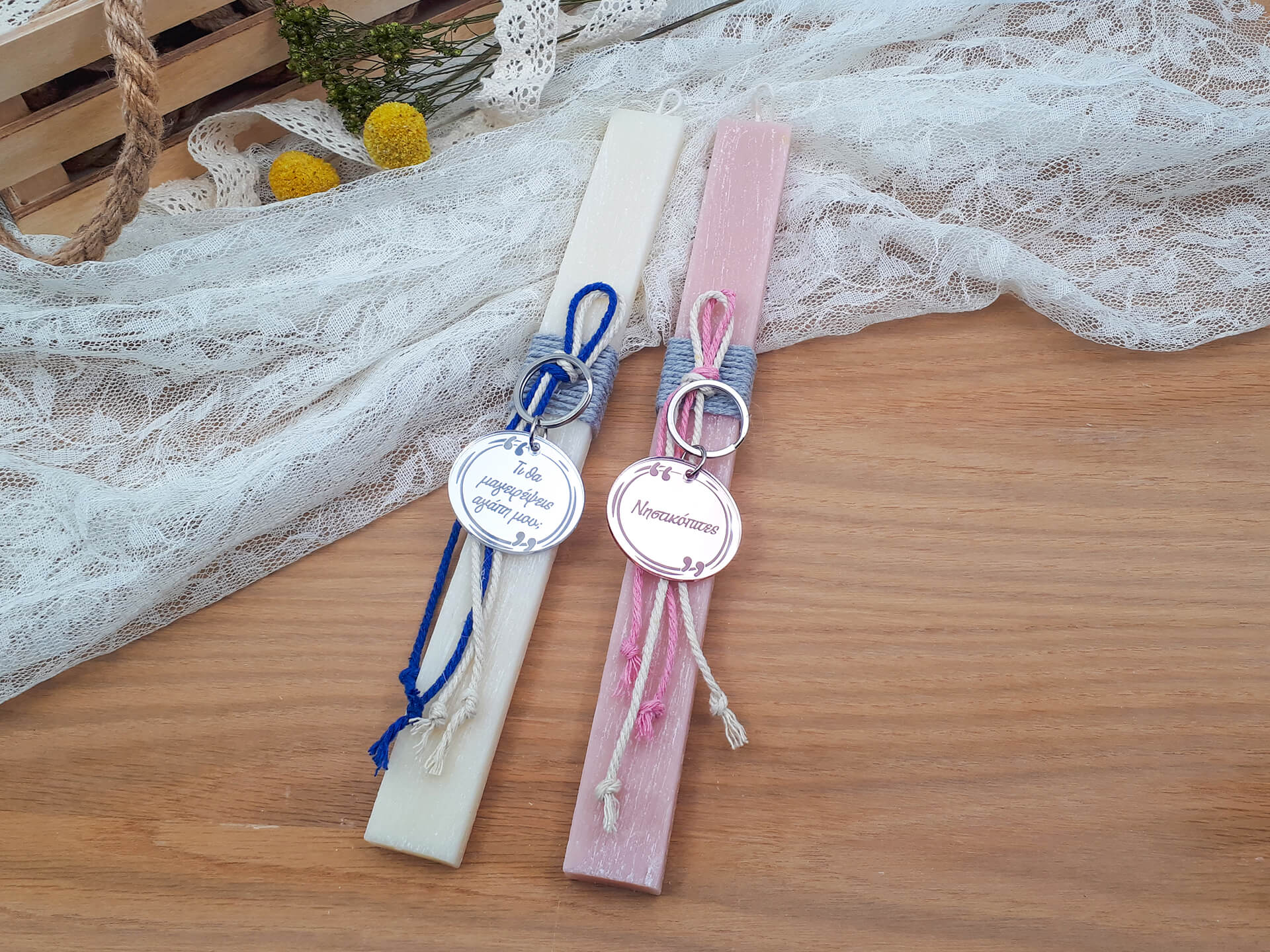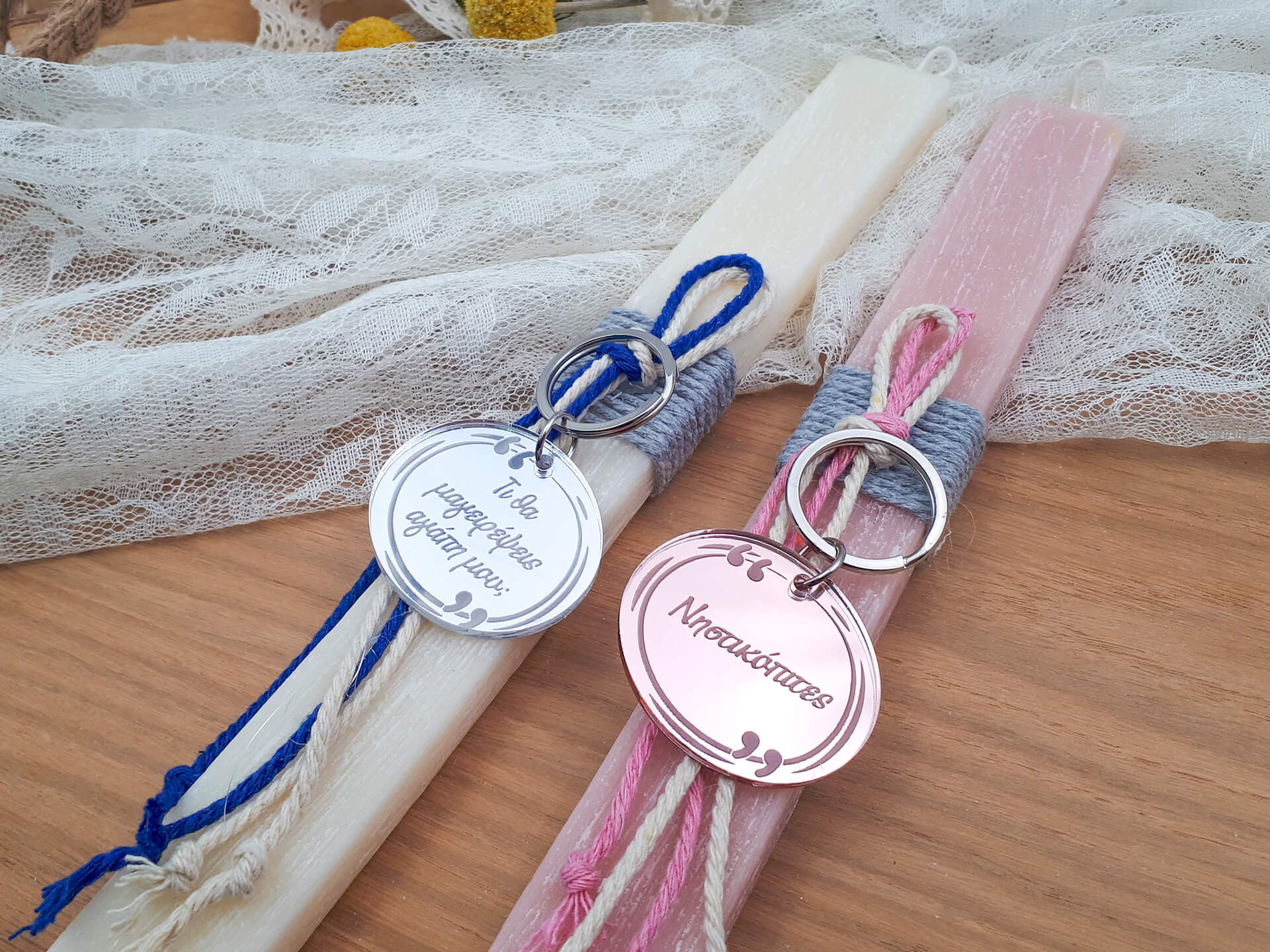 • Υλικά: Σετ λαμπάδες πλακέ 27,5cm, Μπρελόκ από ακρυλικό(plexiglass) καθρέπτης ασημί και rose gold πάχους 3mm