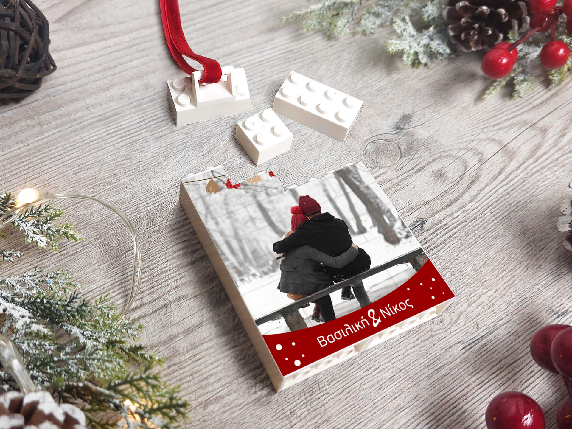 • Υλικά: Τουβλάκια τύπου lego, δεμένο με κόκκινη κορδέλα